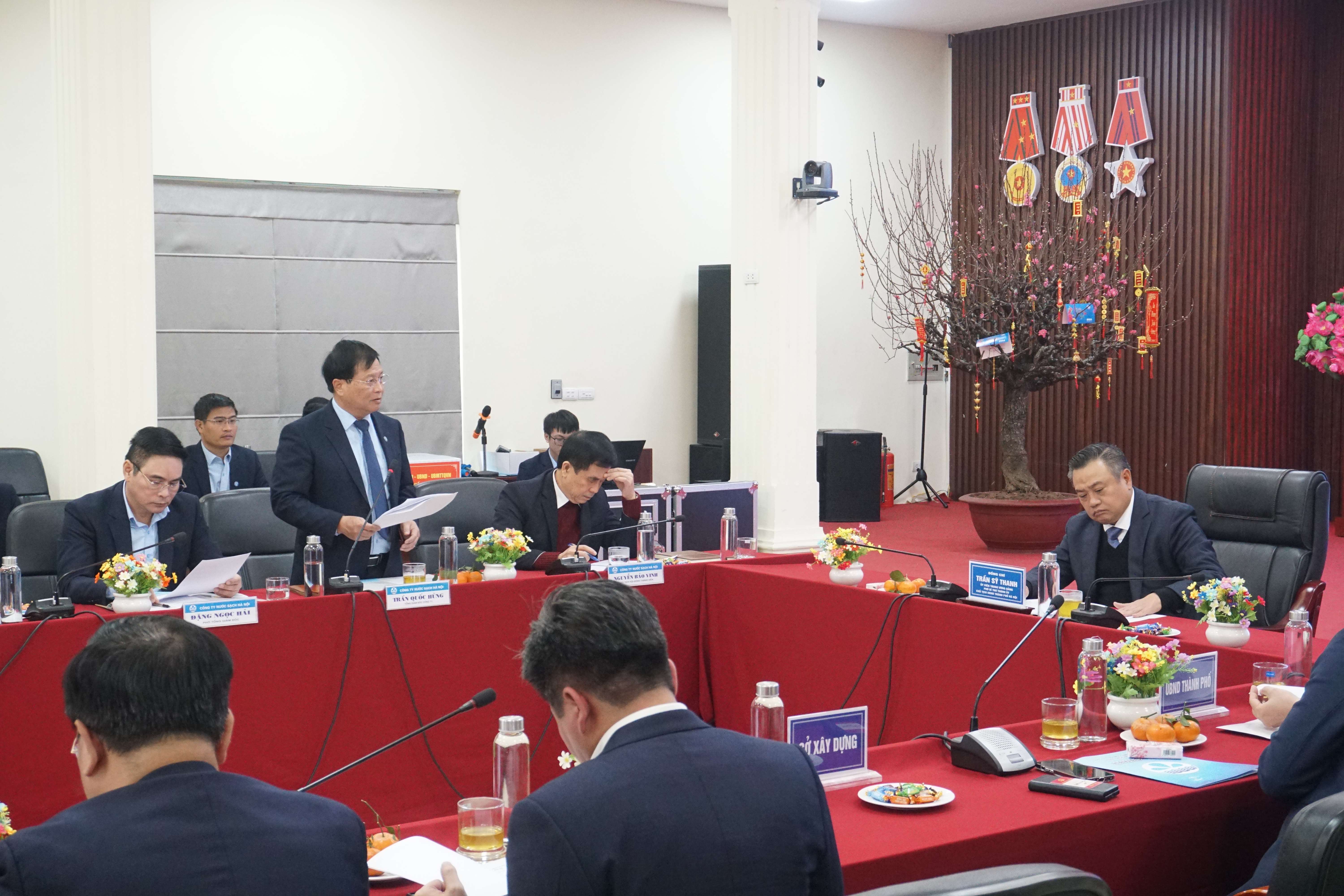 Phát biểu chỉ đạo tại buổi làm việc, đ/c Trần Sỹ Thanh, Chủ tịch UBND Thành phố Hà Nội nhấn mạnh tầm quan trọng của công tác cấp nước trong việc bảo đảm an sinh xã hội của người dân Thủ đô. Đ/c ghi nhận và chúc mừng kết quả hoạt động sản xuất kinh doanh của Công ty trong thời gian qua, đồng thời đánh giá cao sự hỗ trợ, vào cuộc của Công ty Nước sạch Hà Nội với các đơn vị cấp nước khác của Hà Nội khi gặp sự cố về nguồn nước, điển hình là sự cố mất nước của chung cư Thanh Hà. Trong thời gian qua, Công ty Nước sạch Hà Nội đã nỗ lực hiện đại hóa, tăng cường ứng dụng công nghệ thông tin trong sản xuất, phát triển các nguồn nước mặt thay thế dần nguồn nước ngầm, giảm lượng nước thất thoát theo lộ trình được giao. Chủ tịch UBND Thành phố HN lưu ý Công ty cần tiếp tục vượt qua khó khăn giảm tỷ lệ thất thoát, thất thu nước sạch xuống dưới 10%. Trong thời gian sau Tết, Thành phố sẽ tổ chức họp bàn về công tác bảo đảm nước sạch trong năm 2024 và năm 2025, đặc biệt là cao điểm mùa hè năm 2024. Khi có vướng mắc về việc thực hiện các dự án cấp nước sắp tới, yêu cầu các Sở, Ban, Ngành và Công ty NSHN báo cáo ngay lên Thành phố để kịp thời có biện pháp giải quyết.