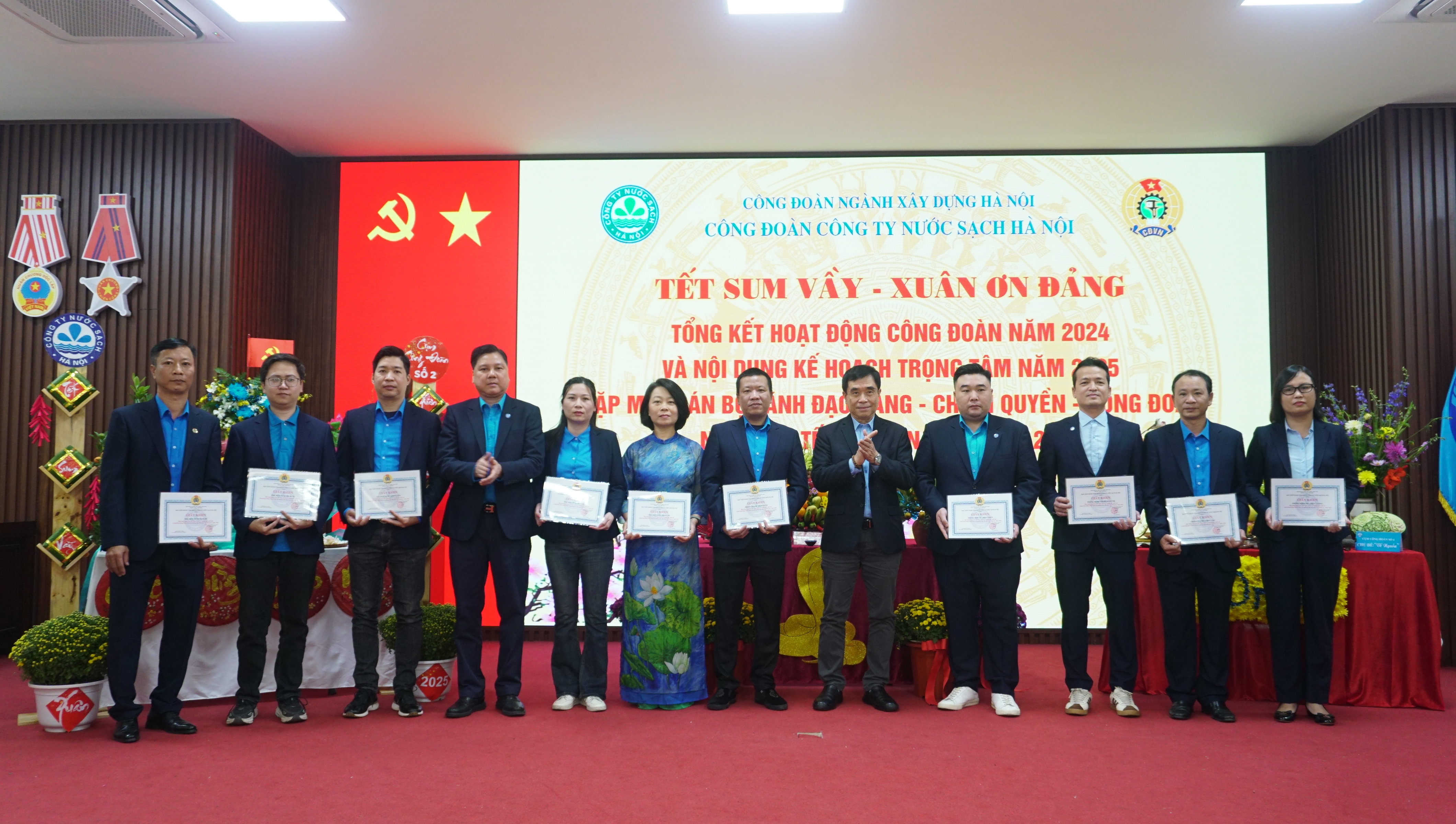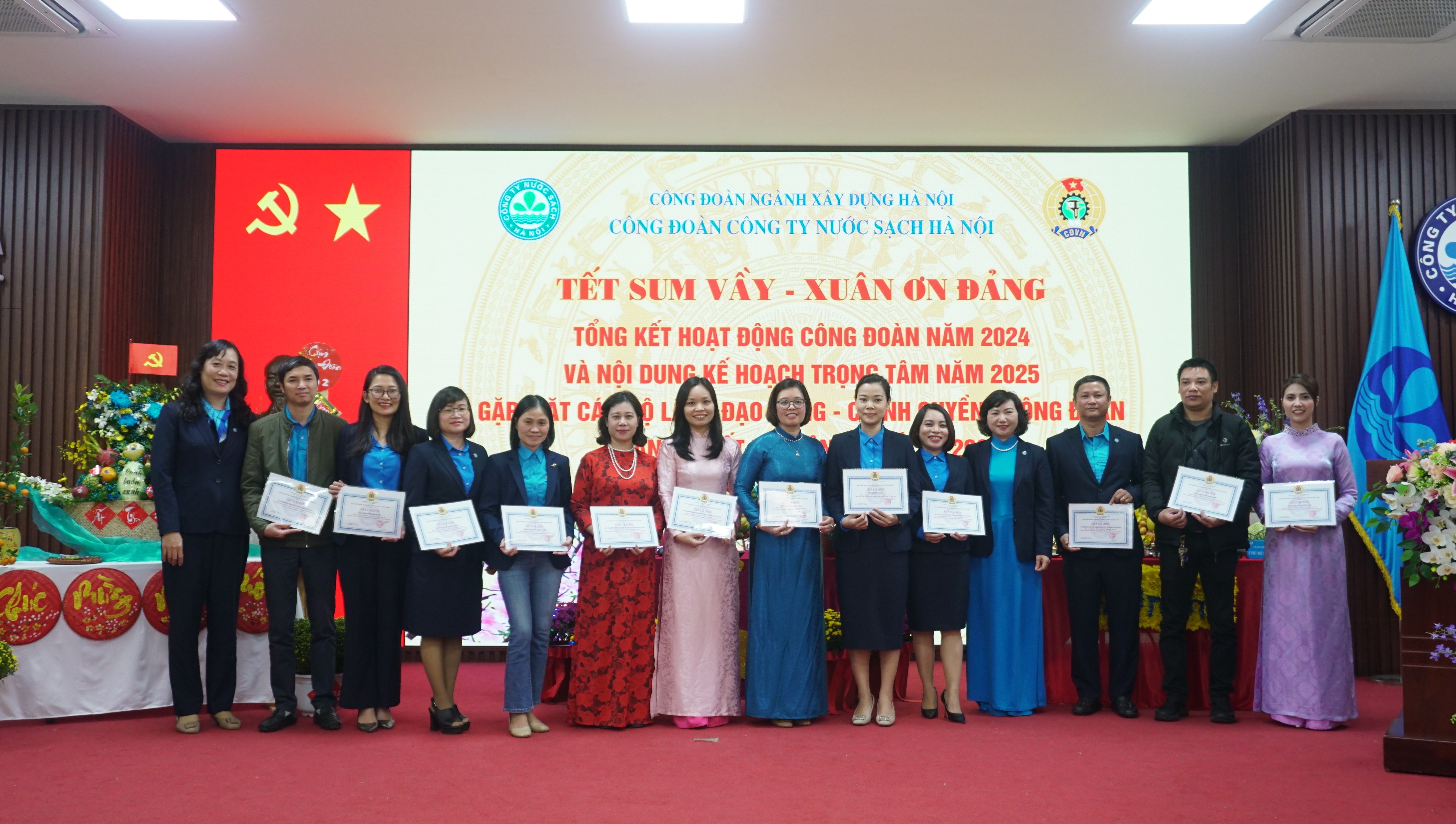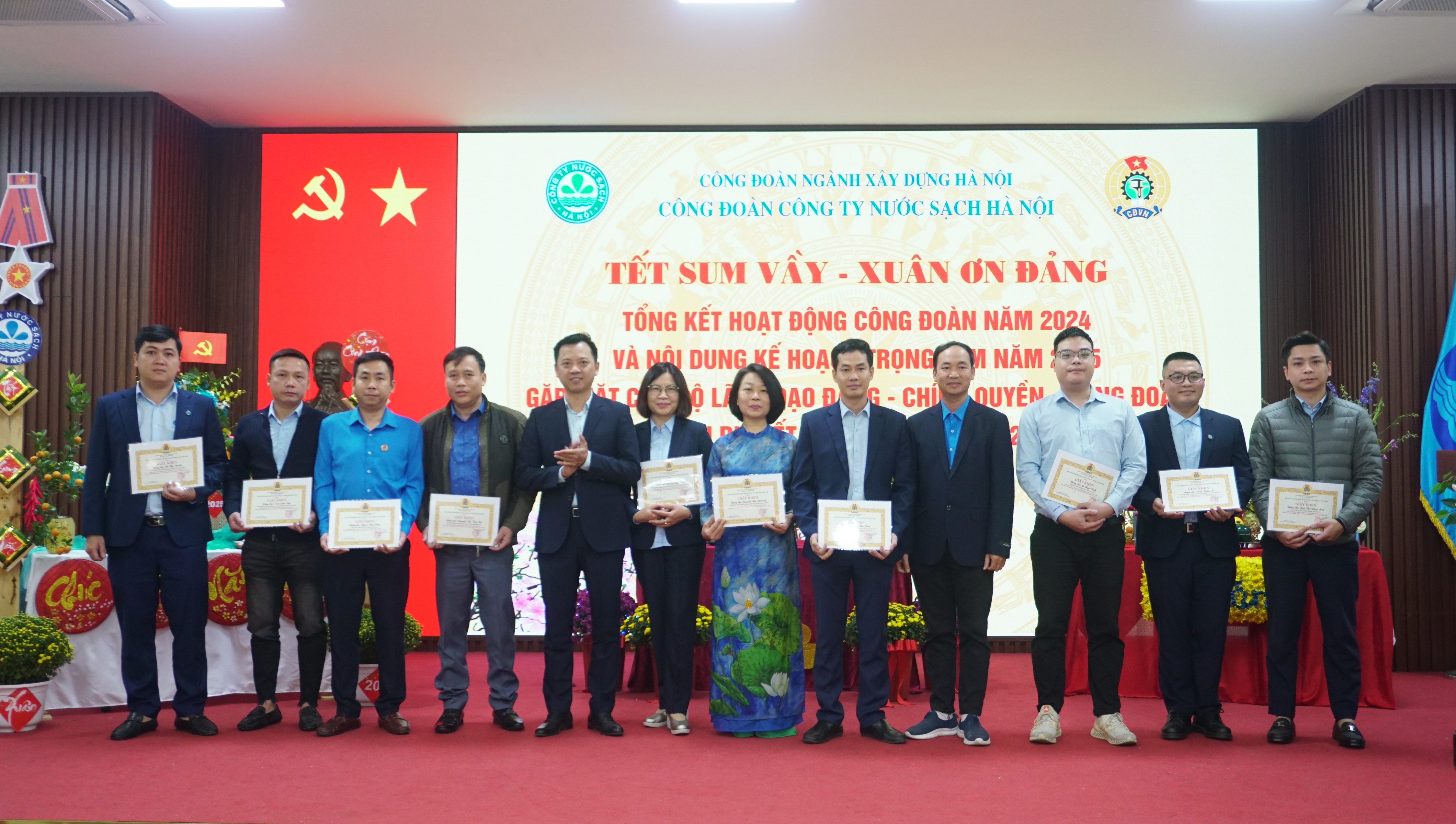 Với những dấu ấn hoạt động trong năm qua, Tổng Liên đoàn Lao động Việt Nam đã trao bằng khen “Công đoàn cơ sở vững mạnh phong trào thi đua xuất sắc năm 2024” cho Công đoàn Công ty Nước sạch Hà Nội; Khen thưởng danh hiệu: “Đã có thành tích xuất sắc trong phong trào thi đua và hoạt động Công đoàn năm 2024” cho 02 cá nhân: ông Trương Tiến Hưng, UV Ban thường vụ Đảng ủy, Phó Tổng giám đốc, Chủ tịch Công đoàn Công ty và bà Trần Thu Trang, UV Ban thường vụ Công đoàn, Bí thư Đoàn thanh niên Công ty.