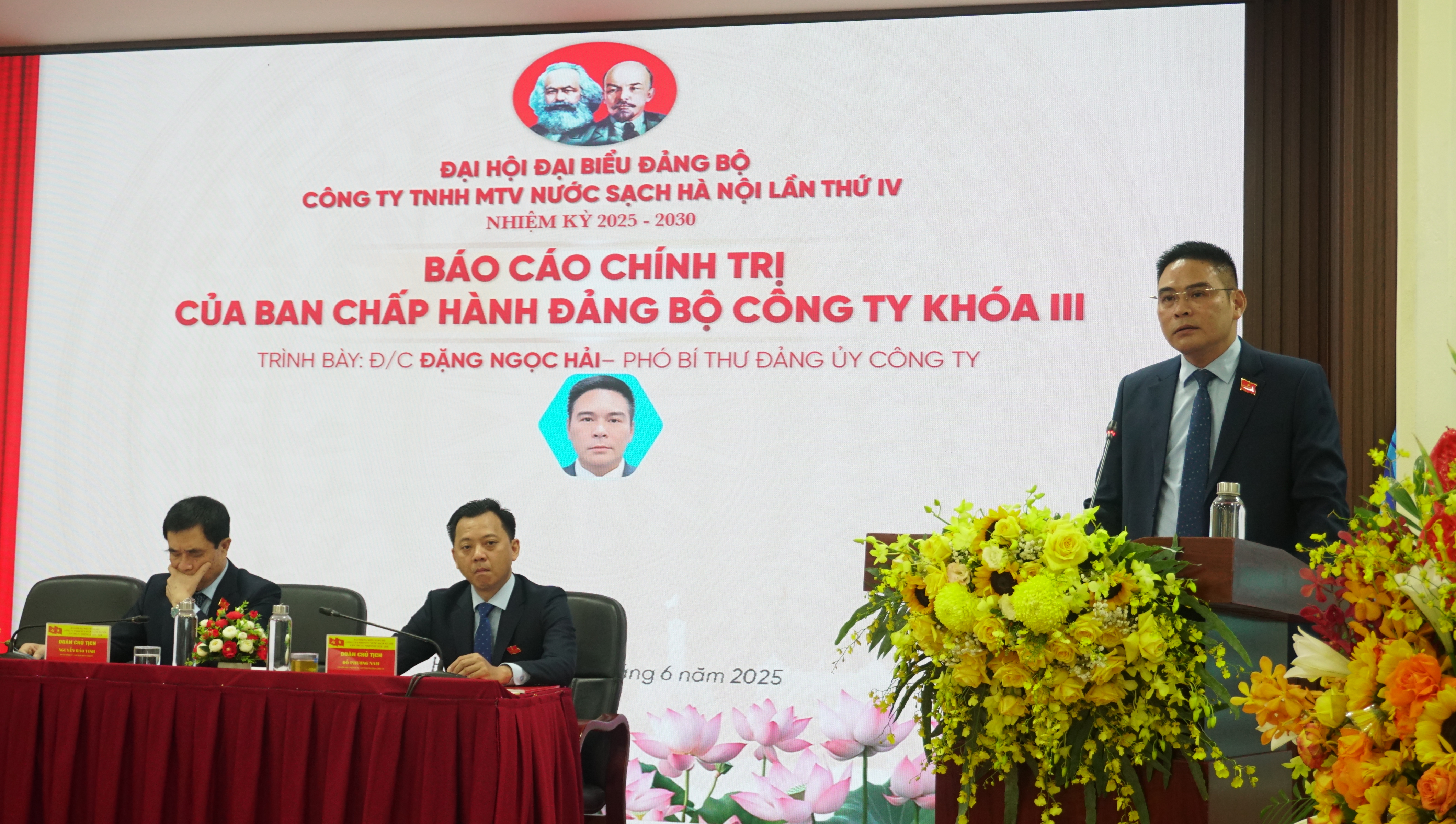 Thay mặt BCH Đảng bộ Công ty, đồng chí Đặng Ngọc Hải đã trình bày Báo cáo chính trị của Ban chấp hành Đảng bộ Công ty Nước sạch Hà Nội khóa III. Đảng bộ Công ty có 32 Chi đảng bộ trực thuộc với 515 đảng viên được sinh hoạt và làm việc tại 01 công ty con; 05 xí nghiệp kinh doanh; 12 nhà máy nước; 04 xí nghiệp phụ trợ và 09 phòng ban chức năng. Thực hiện Nghị quyết Đại hội đại biểu Đảng bộ Công ty Nước sạch Hà Nội lần thứ III nhiệm kỳ 2020 – 2025, Ban Chấp hành Đảng bộ Công ty đã đoàn kết thống nhất chỉ đạo thực hiện nhiệm vụ sản xuất, cung cấp nước sạch đến nhân dân thủ đô Hà Nội trên địa bàn được giao quản lý, đảm bảo lưu lượng và chất lượng theo đúng tiêu chuẩn của Bộ Y tế. Kết quả các chỉ tiêu cơ bản đạt được như sau: Sản lượng nước: Năm 2020 đạt 247.088.637 m3 tương đương 676.955 m3/ngđ; Năm 2024 đạt: 267.441.344 m3 tương đương 732.716 m3/ngđ; tăng 8,2% so với năm 2020; tăng trưởng trung bình năm là 1,65%. Tỷ lệ nước thu tiền: Năm 2020 đạt: 84,52%; Năm 2024 đạt: 88,79%, tăng 4,27% so với năm 2020; tăng trưởng trung bình năm là 0,85%. Doanh thu: Năm 2020 đạt: 1.732 tỷ đồng; Năm 2024 đạt: 2.786 tỷ đồng, tăng 60,8% so với năm 2020. 100% dân số trên địa bàn Công ty quản lý được sử dụng nước sạch với tiêu chuẩn 130 đến 135 lít/người/ngđ. Công ty Nước sạch Hà Nội đã xây dựng Đề án tái cơ cấu lại doanh nghiệp trình UBND Thành phố Hà Nội nhằm tập trung cho việc phục vụ cấp nước ngày càng tốt cho người dân. Đảng bộ lãnh đạo việc thực hiện chế độ với người lao động: đảm bảo 100% người lao động có việc làm, các chế độ của người lao động như bảo hiểm xã hội, y tế, bảo hộ lao động, nâng lương, của người lao động được đảm bảo đúng chế độ quy định của Nhà nước. Công tác giáo dục chính trị tư tưởng được Đảng bộ Công ty đặc biệt chú trọng. Đảng bộ đã bám sát các chủ trương, Nghị quyết của Trung ương, Thành phố Hà Nội, xây dựng kế hoạch tổ chức học tập, quán triệt sâu rộng, gắn với xây dựng các chương trình thực hiện một cách cụ thể, mang lại hiệu quả thiết thực. Hằng năm, Đảng ủy Công ty thực hiện nghiêm túc, đúng quy định công tác đánh giá, xếp loại đối với các chi bộ trực thuộc. Trong đó, số tổ chức Đảng trực thuộc đạt tiêu chuẩn hoàn thành tốt và hoàn thành xuất sắc nhiệm vụ bình quân hàng năm là 95%. Định kỳ vào đầu năm, các tổ chức Công đoàn, Đoàn thanh niên đều thực hiện việc lựa chọn, giới thiệu với Đảng nguồn quần chúng ưu tú, cử đi học các lớp bồi dưỡng kết nạp Đảng. Việc thực hiện các thủ tục, trình tự hồ sơ xét kết nạp luôn bảo đảm nguyên tắc, đúng thẩm quyền. Đảng bộ Công ty được Thành ủy Hà Nội, Đảng ủy Khối khen thưởng “Tổ chức cơ sở đảng trong sạch, vững mạnh – tiêu biểu” nhiều năm liền.