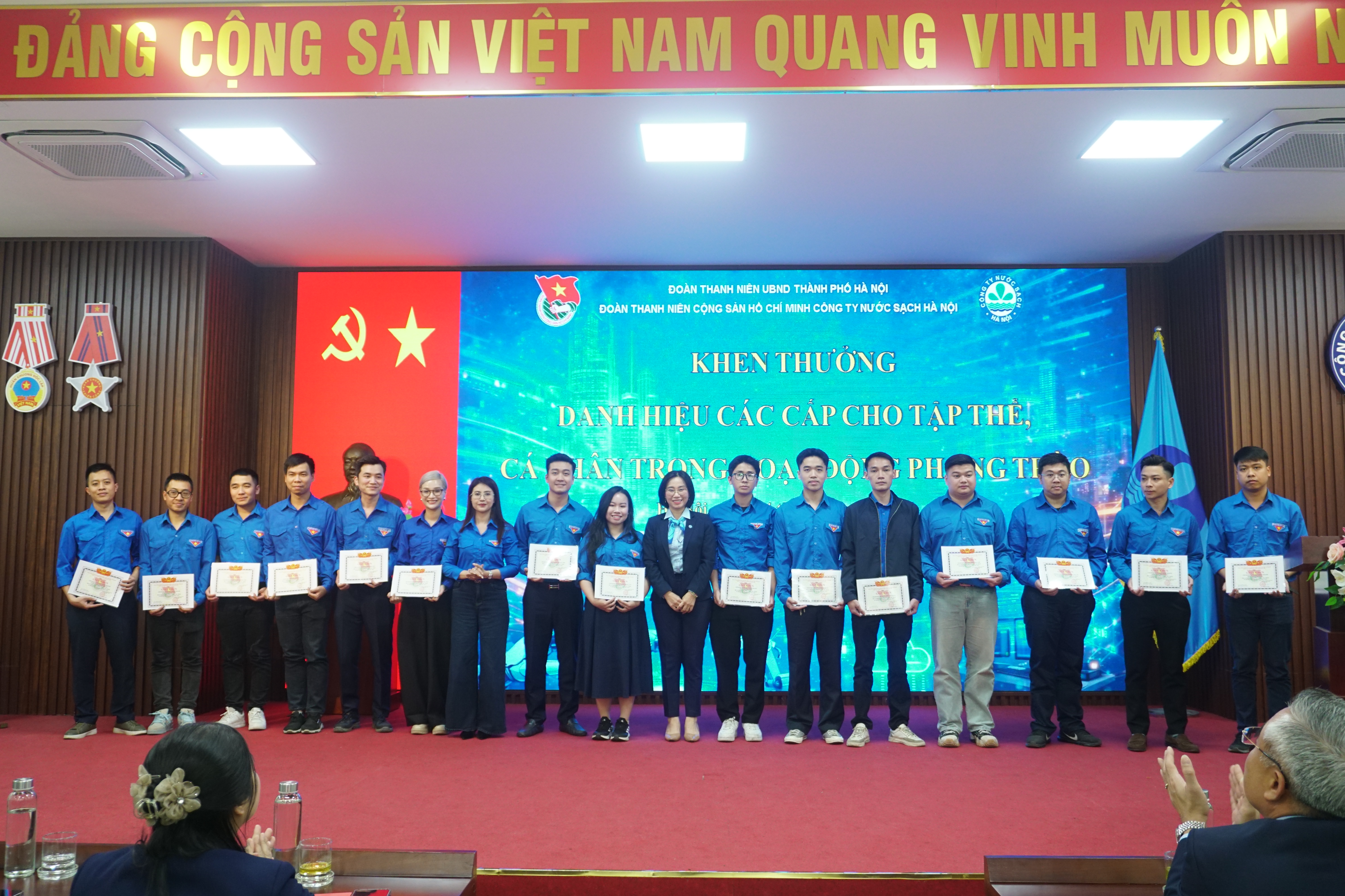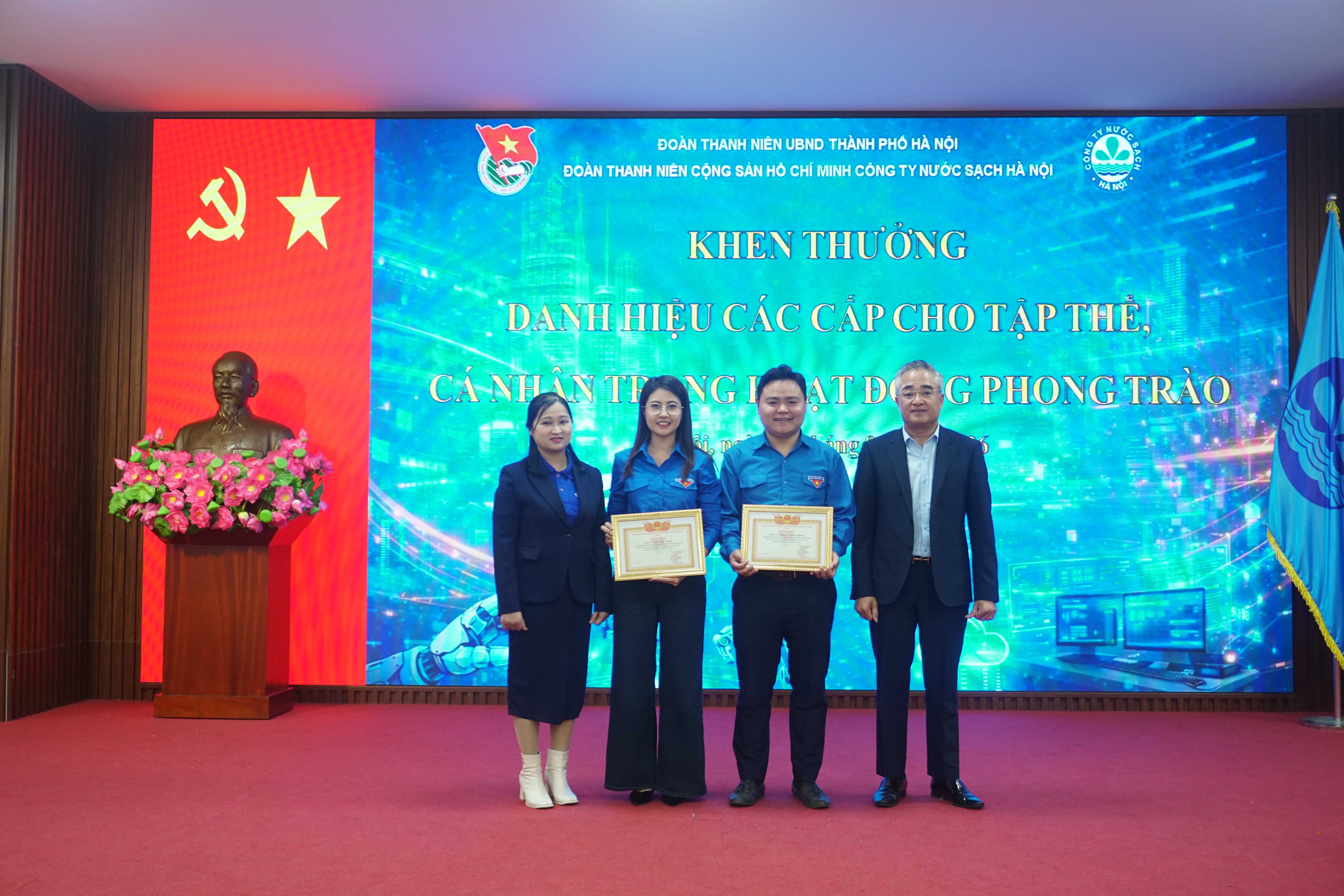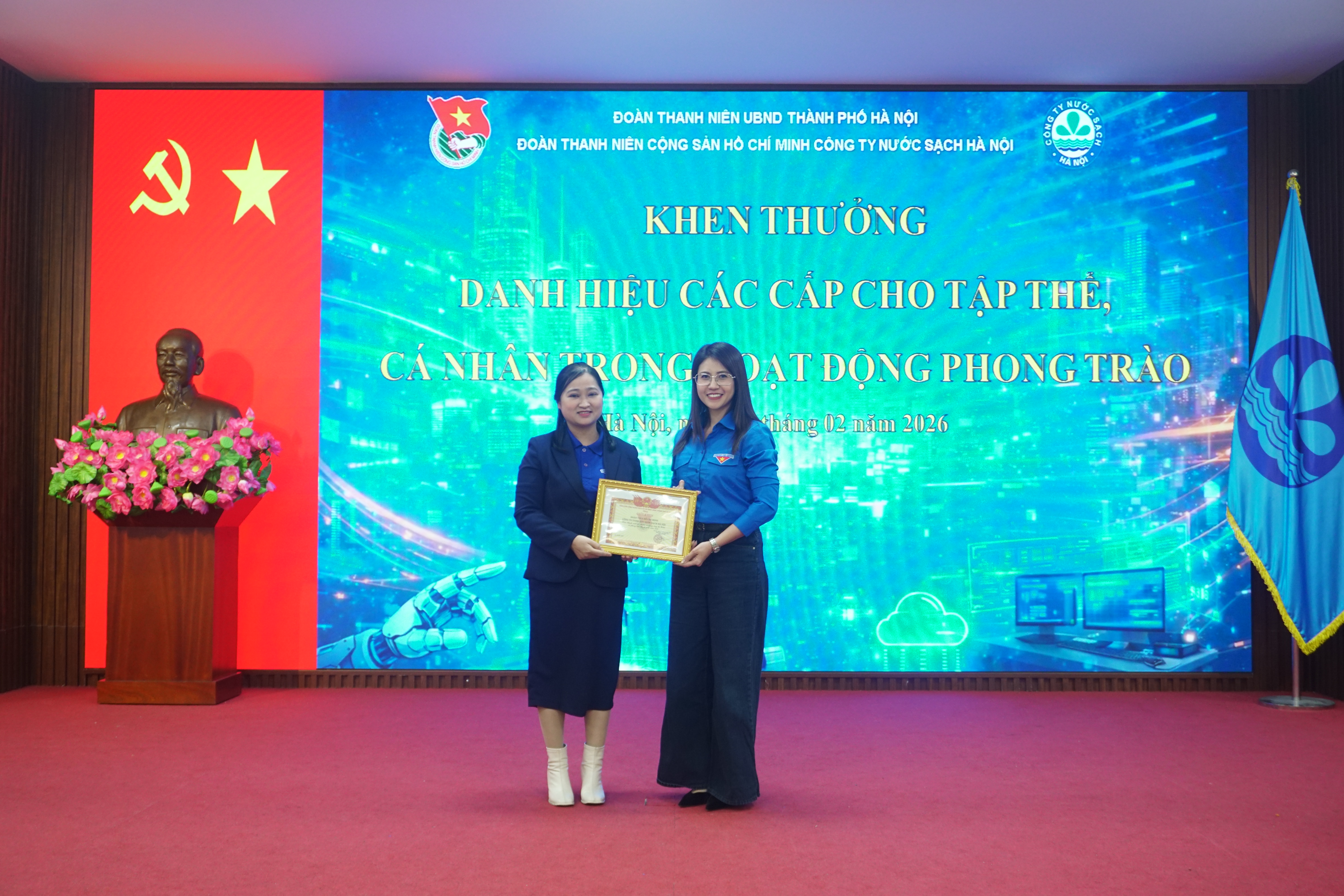 Ghi nhận những thành tích đã đạt được trong hoạt động phong trào của Đoàn Thanh niên Công ty Nước sạch Hà Nội trong năm vừa qua, Đoàn Thanh niên CS HCM UBND Thành phố Hà Nội đã tặng Giấy khen “Hoàn thành xuất sắc nhiệm vụ trong công tác Đoàn và phong trào Thanh niên năm 2025” cho Đoàn Thanh niên Công ty NSHN. Đ/c Trần Thu Trang, Bí thư Đoàn Thanh niên Công ty và đ/c Nguyễn Trường Giang, UV BTV Đoàn Thanh niên Công ty vinh dự được tặng Giấy khen “Hoàn thành xuât sắc công tác Đoàn năm 2025”.