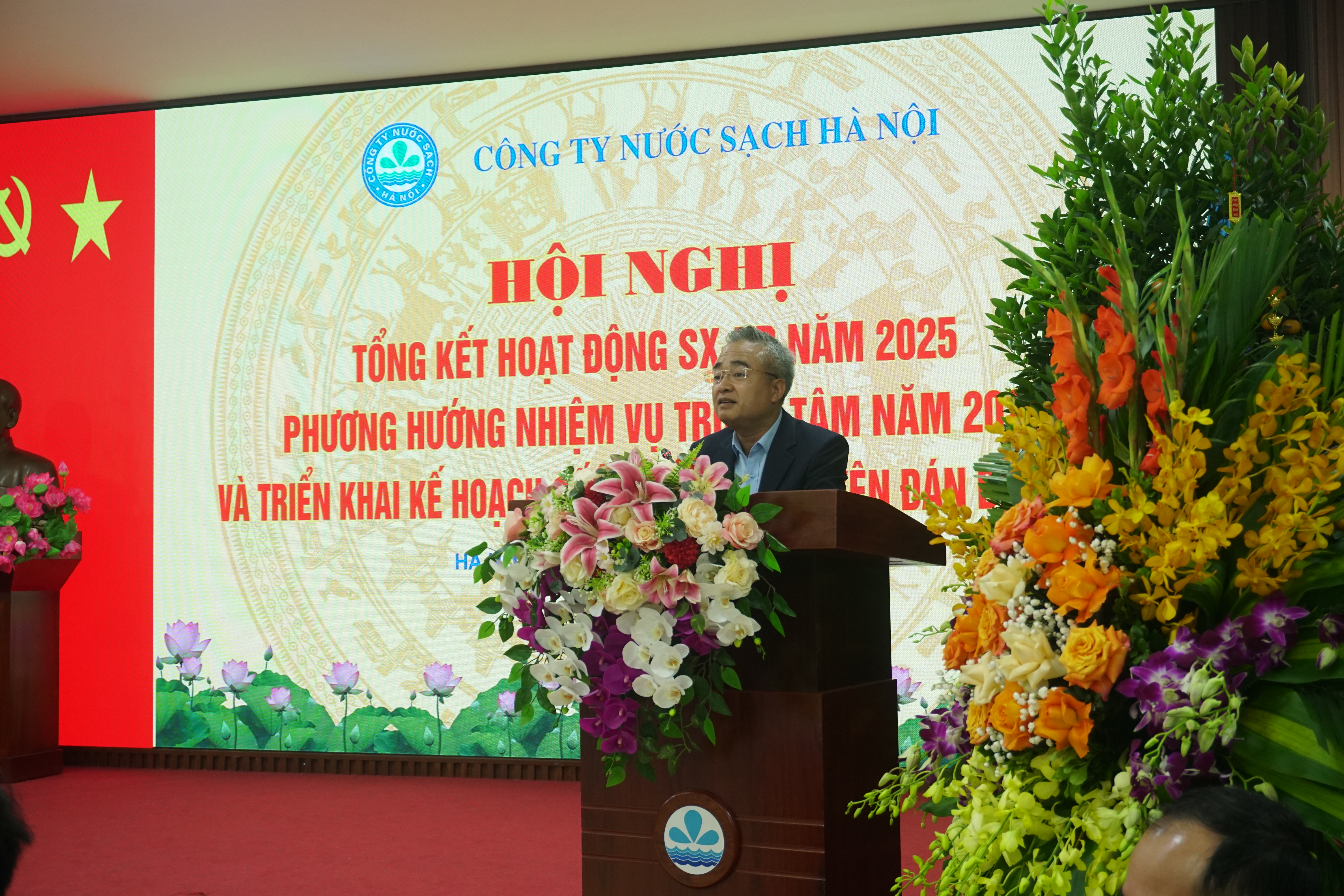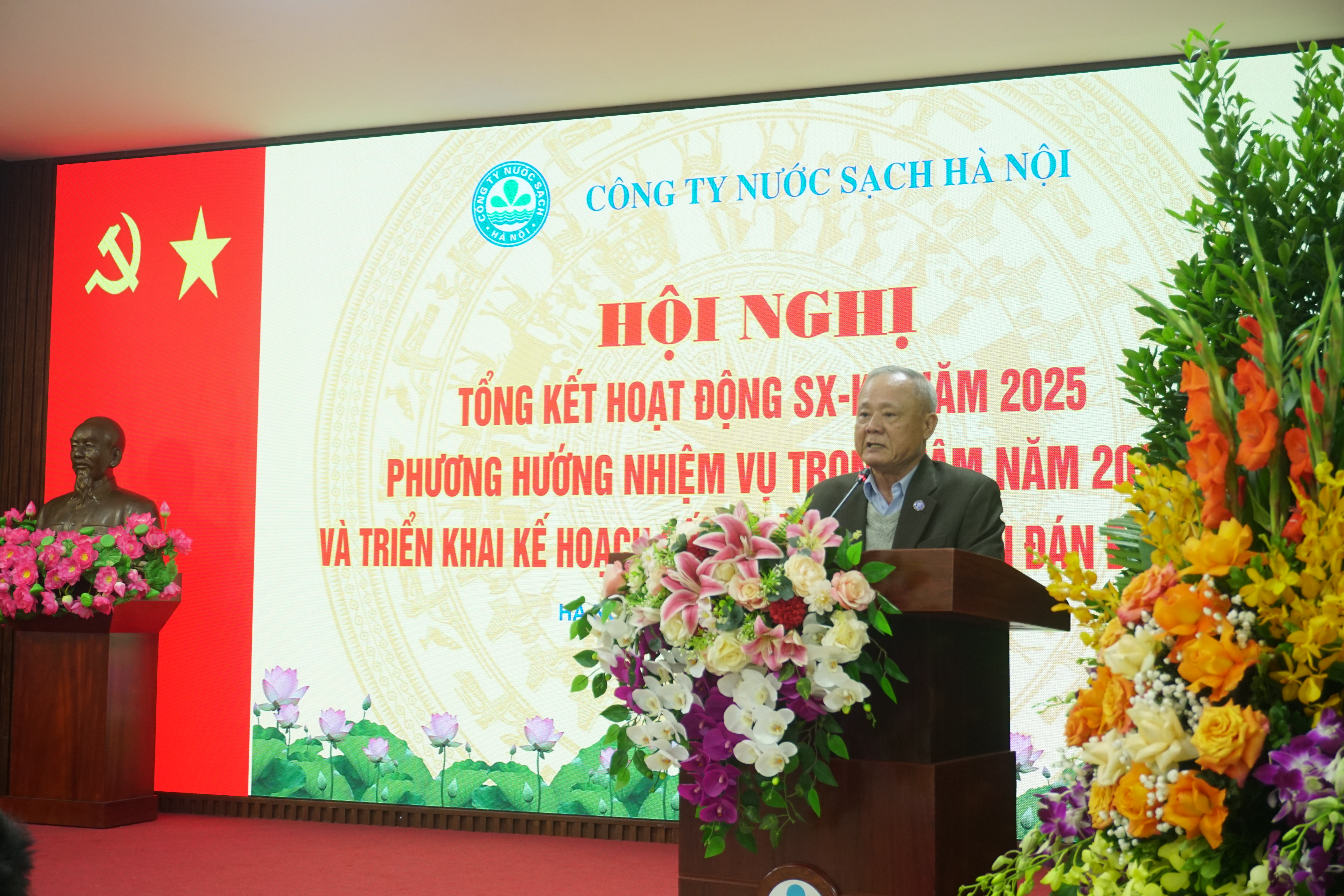 Hội nghị đã cùng nhìn lại những kết quả đáng tự hào của Công ty trong năm 2025. Công ty triển khai kế hoạch SXKD trong điều kiện kinh tế xã hội Việt Nam phục hồi mạnh mẽ, ghi dấu sự chuyển mình mạnh mẽ của đất nước trong chuyển đổi số và số hóa nền kinh tế, gắn với chiến lược nâng cao năng suất lao động theo định hướng công nghiệp 4.0. Bên cạnh đó, cuộc cải cách hành chính có quy mô và mức độ sâu rộng nhất trong nhiều thập niên, khi Việt Nam đồng thời tinh gọn bộ máy trung ương và tái cấu trúc hệ thống chính quyền địa phương chuyển sang mô hình hai cấp gồm tỉnh và xã, phường khiến công tác sản xuất cấp nước của Công ty NSHN phát sinh yêu cầu và nhiệm vụ mới. Dưới sự lãnh đạo toàn diện của Ban Chấp hành Đảng bộ Công ty; Định hướng chiến lược và giám sát chặt chẽ của HĐTV, cùng sự điều hành quyết liệt, linh hoạt của Ban Tổng Giám đốc Công ty, ý chí đoàn kết một lòng của toàn thể CBCNV, công tác cấp nước trên địa bàn Công ty được đảm bảo ổn định, liên tục, không xuất hiện những khu vực mất nước, thiếu nước kéo dài. Các chỉ tiêu SXKD năm 2025 đều đạt và vượt kế hoạch SXKD: Tổng sản lượng nước cấp vào mạng lưới đạt 273.163.534 m3, đạt 100,86% so với KH. Nước tự sản xuất toàn Công ty đạt: 207.050.725 m3 tương ứng 99,45% so với KH. Nước mua sông Đà, sông Đuống: 66.112.809 m3 tương ứng 181.131 m3/ngđ tương ứng 105,55% so với KH. Tỷ lệ Nước thu tiền toàn Công ty đạt 89,46%, tăng 0,47% so với KH. Đặc biệt, Tỷ lệ nước thu tiền toàn Công ty Quý IV/2025 đạt 91%, lần đầu tiên tỷ lệ thất thoát xuống 1 con số (dưới 10%), thể hiện hiệu quả quản lý, đầu tư, sử dụng nguồn vốn chi phí cũng như công tác chống thất thoát thất thu chủ động của các đơn vị. Tổng doanh thu: 2.791.674 triệu đồng, đạt 103,16% KH. Nộp ngân sách nhà nước: 358.677 triệu đồng, đạt 102,71% KH. Công tác ứng dụng công nghệ thông tin vào sản xuất kinh doanh tiếp tục được đẩy mạnh, giúp nâng cao chất lượng dịch vụ cấp nước thông qua việc thực hiện: Dịch vụ công toàn trình, tổng đài chăm sóc khách hàng 19004600 hoạt động 24/7, trung tâm vận hành cấp nước, văn phòng điện tử… Các nhóm dự án được triển khai bám sát tiến độ kế hoạch và đáp ứng được các mục tiêu: Giải quyết hiệu quả các điểm thiếu nước, giảm lượng nước thất thoát, tăng tỷ lệ nước thu tiền, nâng cao chất lượng nước và mở rộng phạm vi cấp nước. Công ty đã tổ chức 18 khóa đào tạo cho 3900 lượt CBCNV. Hoàn thành các khóa đào tạo bồi dưỡng nghề, thi nâng bậc thợ và nâng lương các ngành nghề cho hơn 1440 lao động nhằm xây dựng 1 đội ngũ công nhân lành nghề, giỏi nghề, có cơ cấu ngành nghề, bậc thợ phù hợp với yêu cầu sản xuất kinh doanh của Công ty.