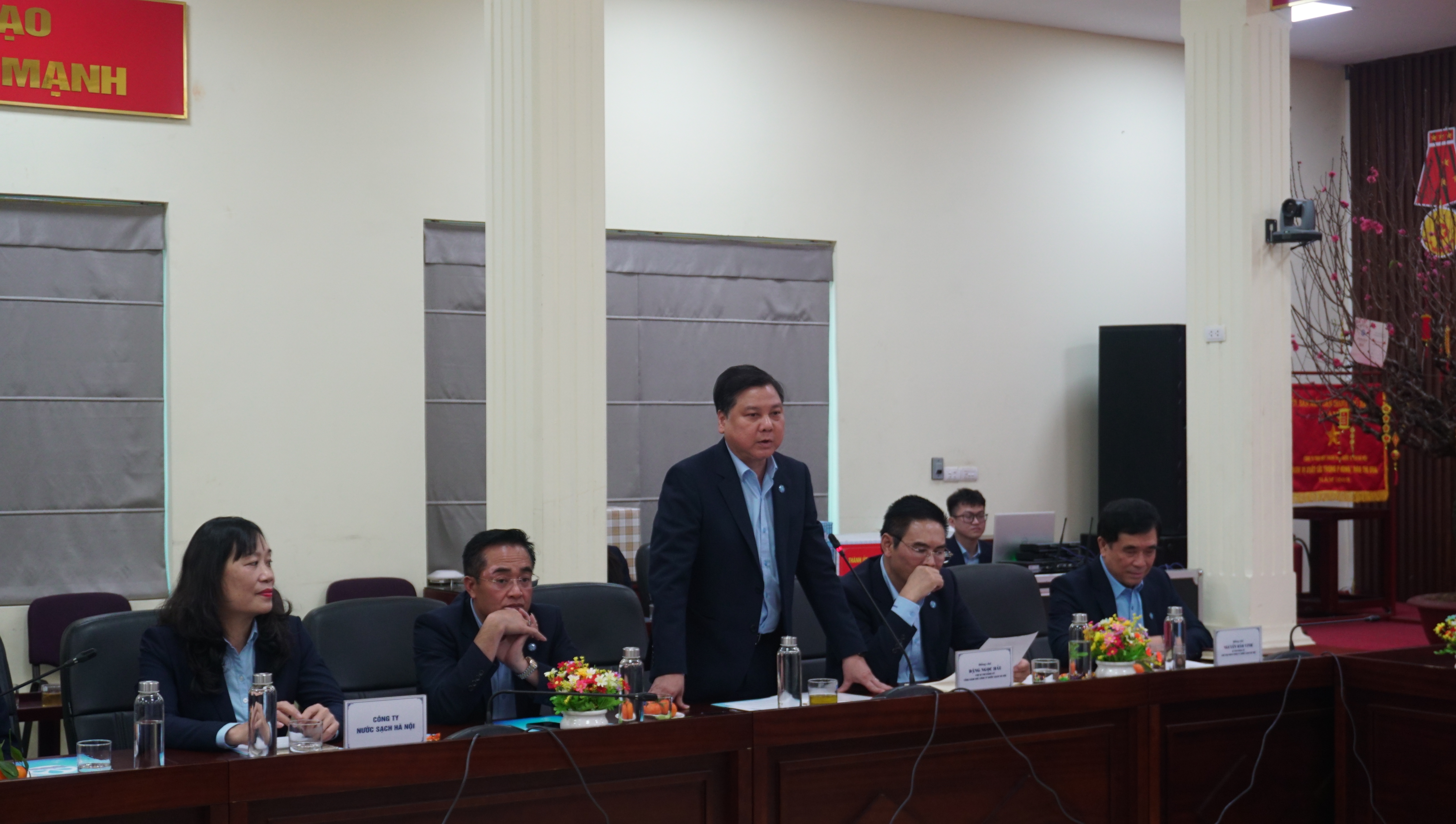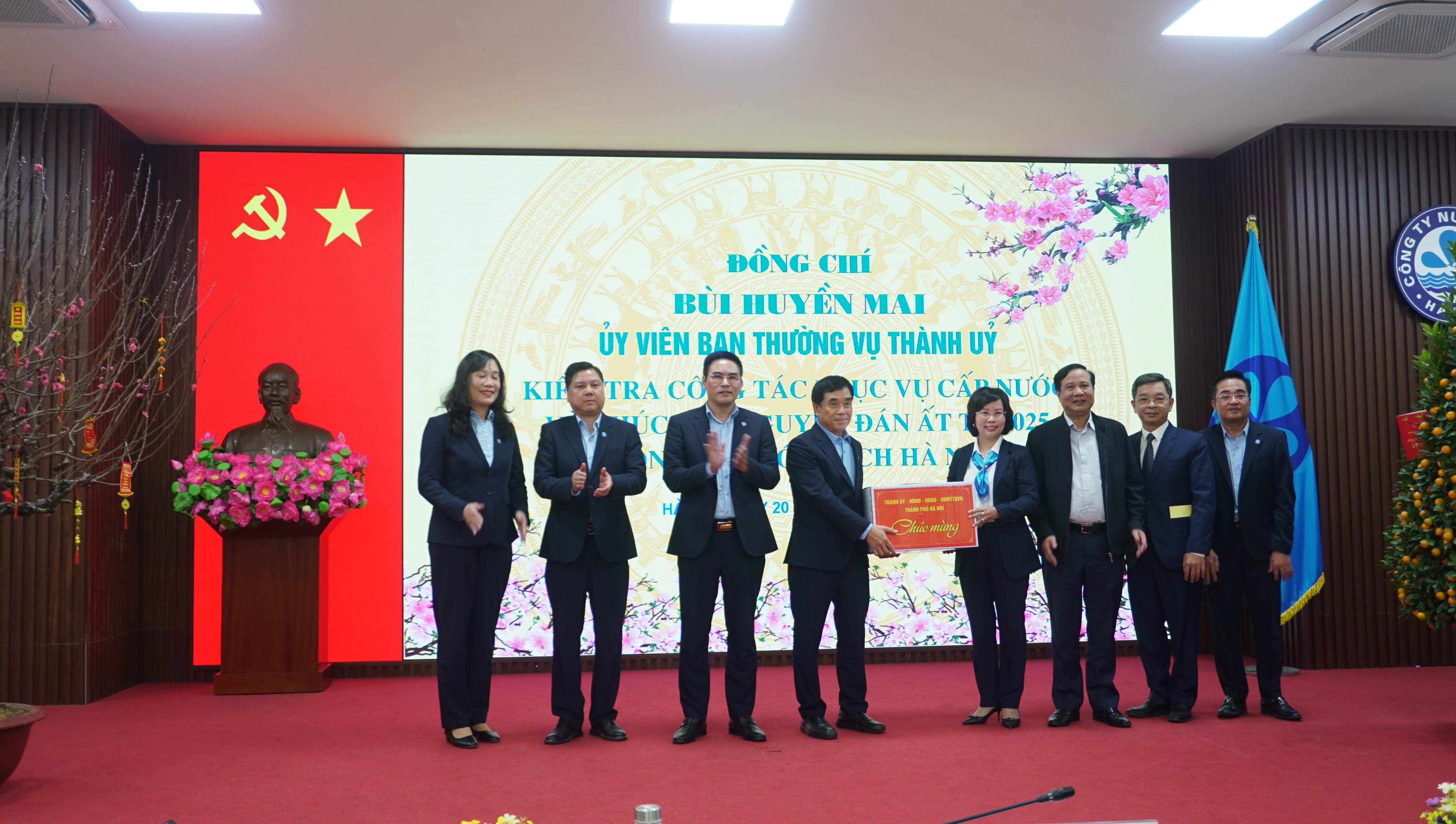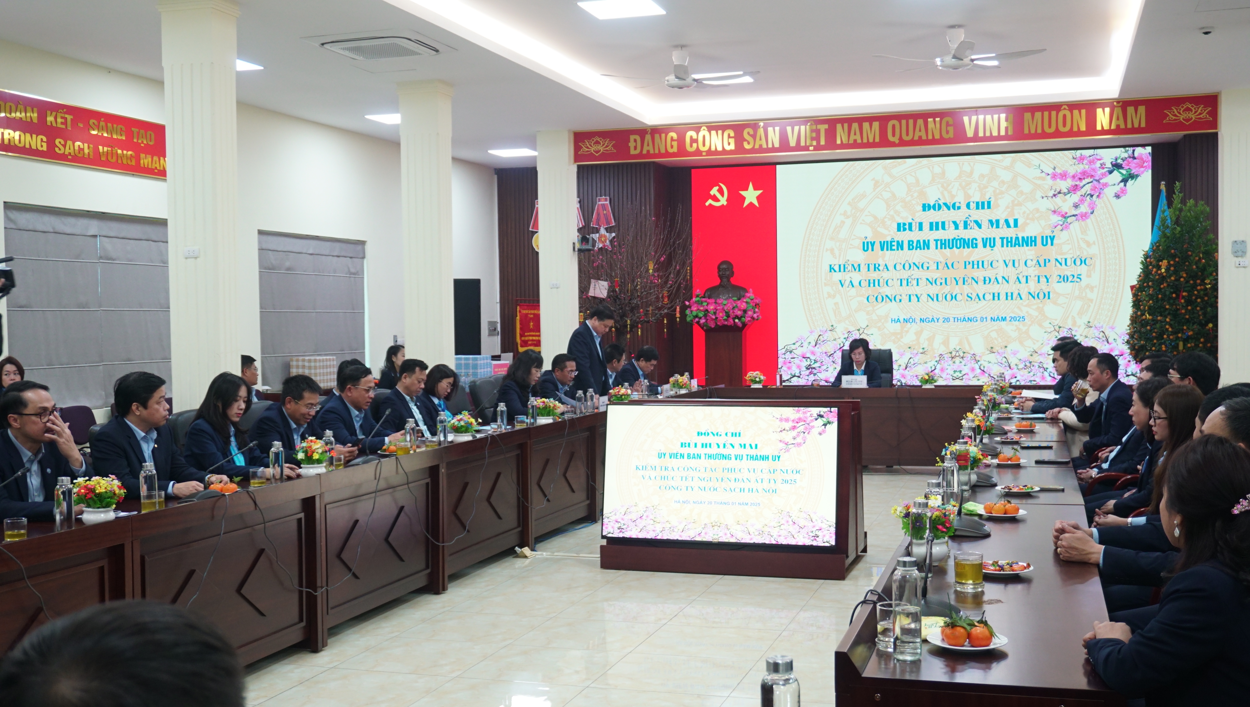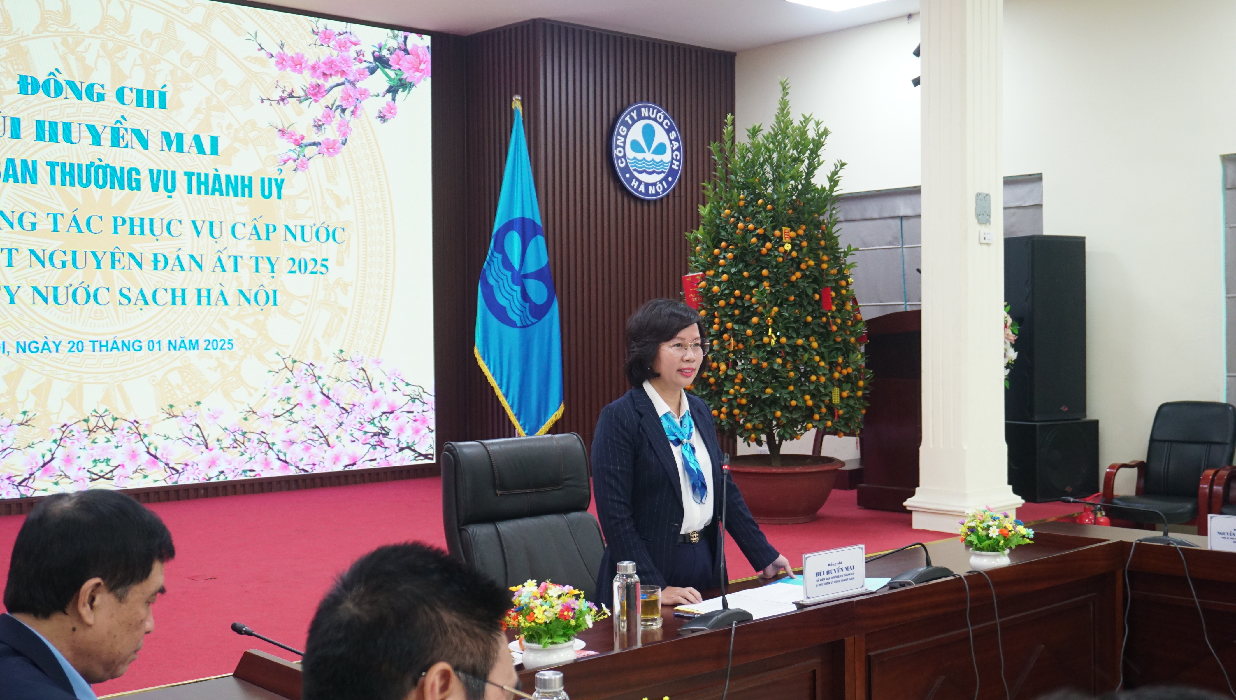 Đồng chí Bùi Huyền Mai, Ủy viên Ban Thường vụ Thành ủy chúc mừng, biểu dương, ghi nhận những thành tích đã đạt được trong năm vừa qua của Công ty Nước sạch Hà Nội. Đặc biệt đồng chí ấn tượng với kết quả đạt doanh thu gần 2.800 tỷ, tỷ lệ nước thu tiền đạt 88,79% của Công ty và Tổng đài chăm sóc khách hàng 19004600 đi vào hoạt động hiệu quả đã giúp nâng cao mức độ dịch vụ khách hàng. Năm 2025, dự báo bối cảnh tình hình quốc tế diễn biến phức tạp có ảnh hưởng đến nền kinh tế trong nước. Đặc biệt năm 2025 có nhiều sự kiện chính trị quan trọng của Thủ đô và dân tộc như: Kỷ niệm 80 năm Ngày thành lập nước Việt Nam Dân chủ Cộng hòa (nay là nước Cộng hòa Xã hội chủ nghĩa Việt Nam) (2/9/1945 – 2/9/2025); Kỷ niệm 95 năm Ngày Thành lập Đảng Cộng sản Việt Nam (3/2/1930 – 3/2/2025); Kỷ niệm 50 năm Ngày Giải phóng miền Nam, thống nhất đất nước (30/4/1975 – 30/4/2025); Tiến hành Đại hội Đảng các cấp hướng đến Đại hội đại biểu lần thứ XVIII của Đảng bộ Thành phố Hà Nội và tiến tới Đại hội lần thứ XIV của Đảng Cộng sản Việt Nam. Đồng chí yêu cầu Ban lãnh đạo Công ty tập trung vào 5 nhiệm vụ trọng tâm chính: Thường xuyên theo dõi tình hình, cập nhật và thực hiện nghiêm túc các chỉ đạo chung từ Thành ủy, Hội đồng Nhân dân, Ủy ban Nhân dân Thành phố. Nâng cao chỉ tiêu cấp nước lên 135 – 140 lít/người/ngđ. Đầu tư các dự án mở rộng mạng lưới cấp nước ra khu vực ngoại thành 21 xã huyện Thường Tín và 8 xã thuộc huyện Thạch Thất, tạo thế phát triển mới trong giai đoanh phát triển chung của Thủ đô. Về công tác cấp nước Tết Nguyên đán, yêu cầu Công ty có kế hoạch ứng trực, bảo đảm cấp nước ổn định cho người dân cũng như đảm bảo phục vụ các nhiệm vụ chính trị, đặc biệt là các cơ quan, đơn vị đặc thù trực Tết như bệnh viện, phòng cháy chữa cháy… Tạm dừng thi công đào đường, đào hè trong thời gian nghỉ Tết nguyên đán trừ trường hợp các sự cố về nước bất khả kháng.