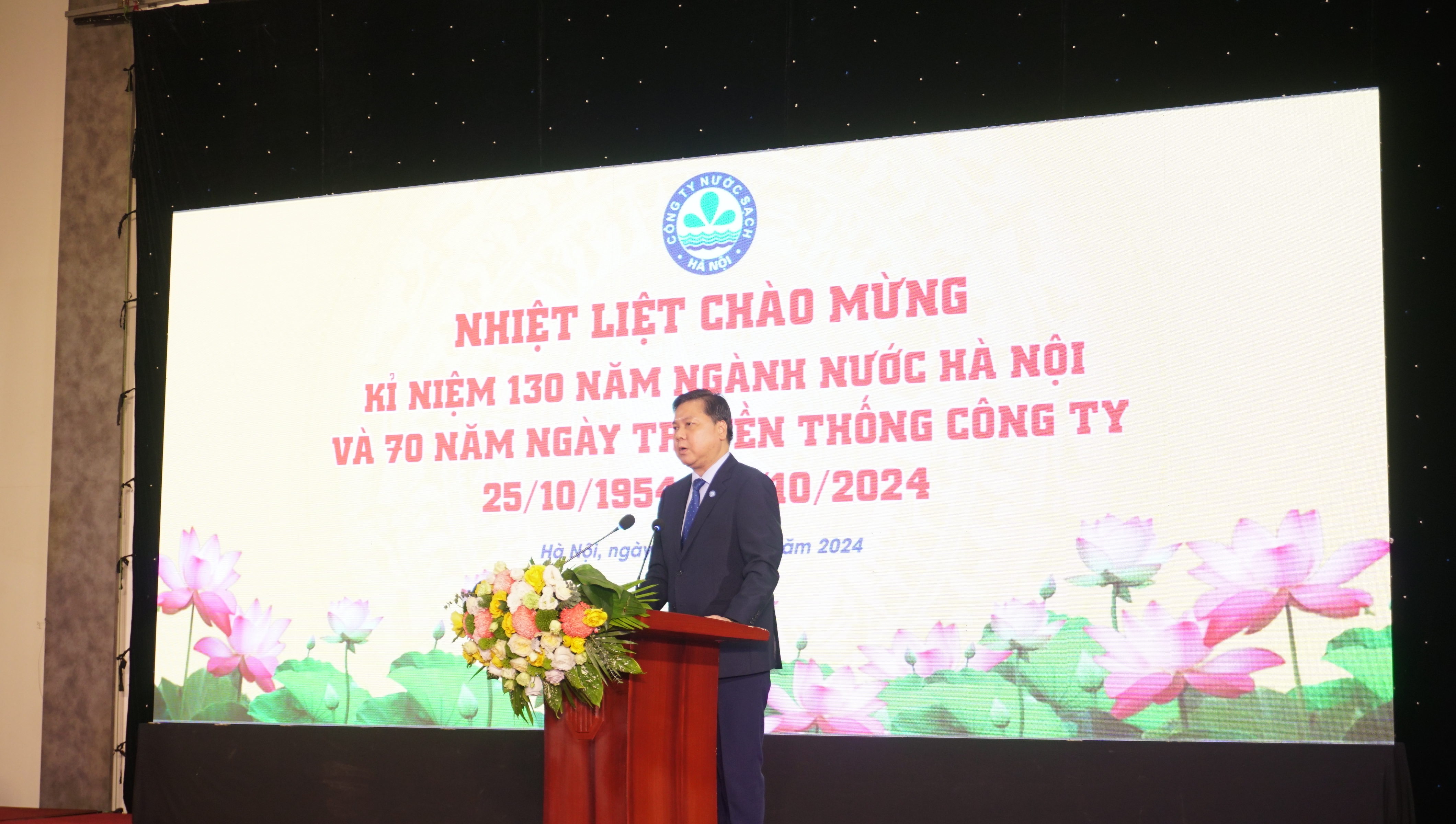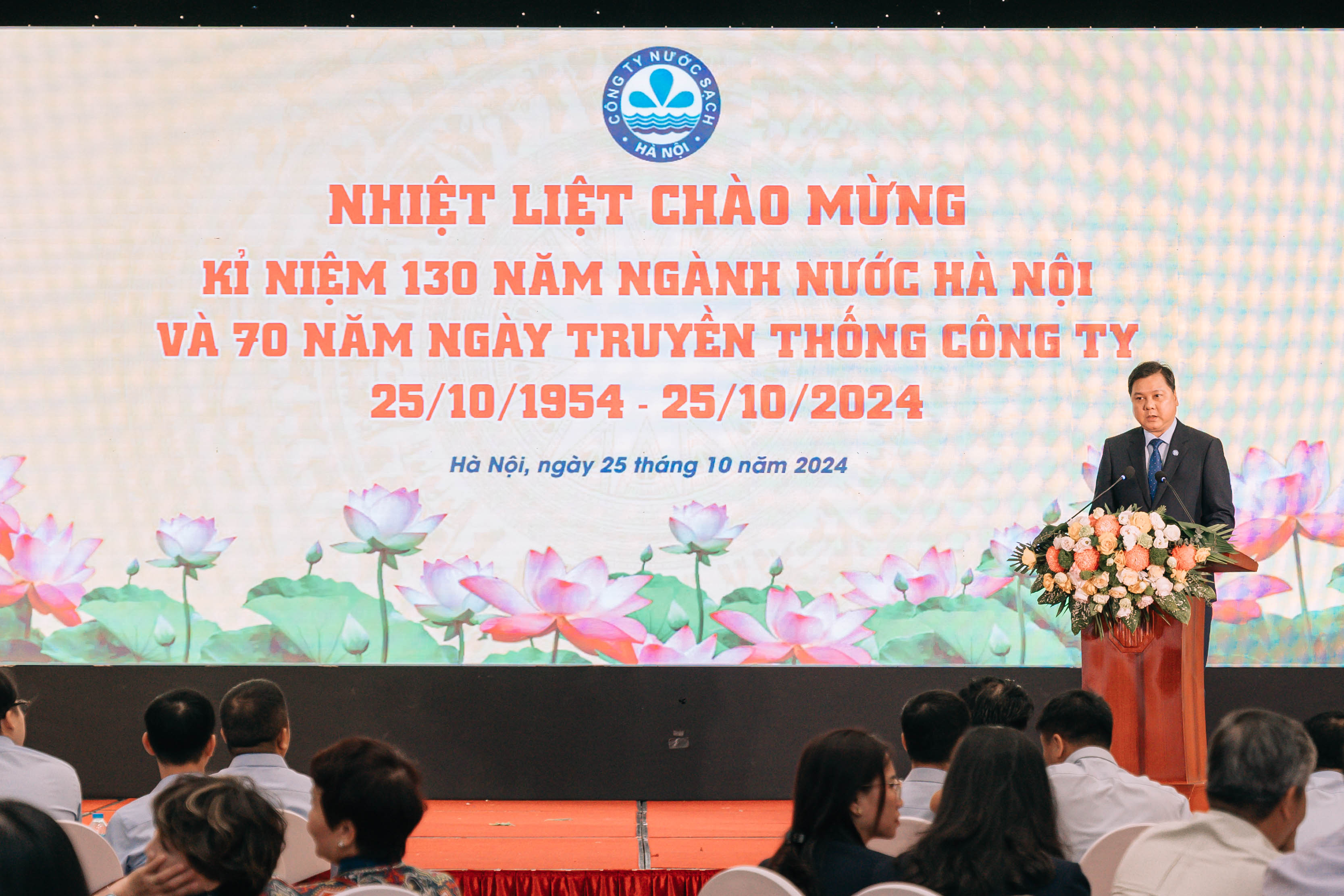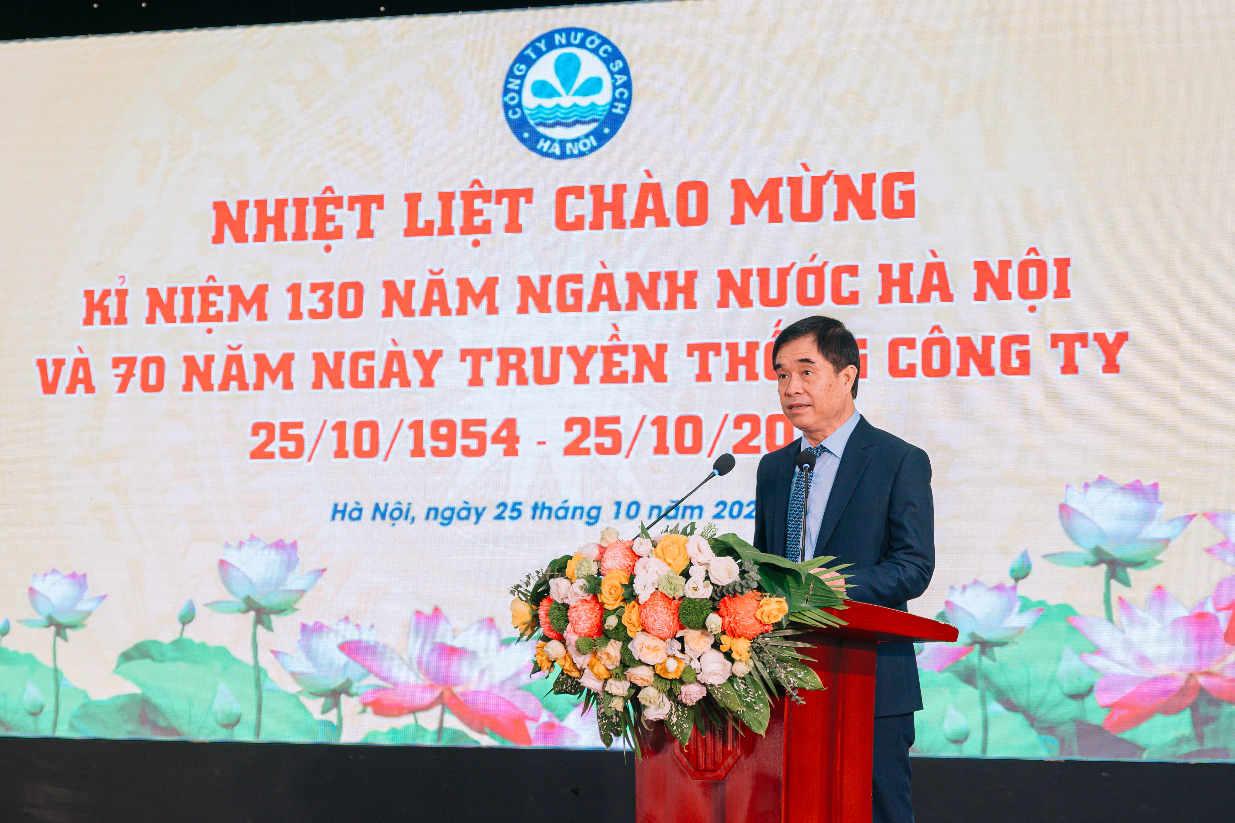 Thay mặt Ban lãnh đạo Công ty, ông Nguyễn Bảo Vinh, Bí thư Đảng ủy, Chủ tịch Hội đồng thành viên Công ty đã đọc diễn văn khai mạc ôn lại truyền thống hào hùng của Công ty Nước sạch Hà Nội. Tiền thân của Công ty Nước sạch Hà Nội là Nhà máy nước Yên Phụ, được khởi công xây dựng vào năm 1894 với công suất 4.000 m3/ngđ. Sau giải phóng Thủ đô, vào ngày 25/10/1954, Sở máy nước thuộc về chính quyền mới, thuộc về người lao động và mang tên Nhà máy nước Hà Nội. Trong giai đoạn 1954-1975, CBCNV Nhà máy nước Hà Nội vừa chiến đấu vừa sản xuất, bảo đảm cung cấp nước sinh hoạt cho nhân dân Thủ đô. Năm 1978, Nhà máy nước Hà Nội đổi tên thành Công ty cấp nước Hà Nội thuộc Sở Công trình đô thị Hà Nội. Thông qua các dự án đầu tư viện trợ không hoàn lại của các nước XHCN, của Chính phủ Phần Lan, chính phủ Nhật Bản cũng như vay vốn đầu tư của Ngân hàng thế giới..., năng lực cấp nước, phạm vị cấp nước của Công ty đã không ngừng phát triển và mở rộng đáp ứng yêu cầu xây dựng và phát triển Thủ đô Hà Nội. Năm 2008 là năm đánh dấu bước chuyển đổi cơ bản về mô hình tổ chức và hình thức hoạt động của Công ty KDNS Hà Nội, khi UBND thành phố Hà Nội quyết định chuyển đổi hoạt động theo hình thức Công ty mẹ - Công ty con tạo điều kiện chủ động, sáng tạo và tự chịu trách nhiệm xây dựng, phát triển, hội nhập Công ty trong xu thế phát triển chung của Đất nước và Thủ đô Hà nội. Trên cơ sở Quy hoạch chung xây dựng Thủ đô Hà Nội đến năm 2030, tầm nhìn đến năm 2050 được Thủ tướng Chính phủ phê duyệt, để giảm bớt khai thác nguồn nước ngầm, năm 2015, Công ty NSHN đã triển khai dự án dự án bổ sung công suất NMN Bắc Thăng Long – Vân Trì công suất 30.000 m3/ngđ, để NMN Bắc Thăng Long hoạt động đạt công suất thiết kế 50.000 m3/ngđ. Đây là bước phát triển mới của Công ty khi sử dụng nguồn nước thô lấy từ nguồn nước mặt sông Hồng thông qua Trạm bơm Ấp Bắc để bổ sung nguồn cho NMN Bắc Thăng Long, giải quyết tình trạng khó khăn về nước sạch trên địa bàn huyện Đông Anh, các quận Cầu Giấy, Tây Hồ, Nam Từ Liêm, Bắc Từ Liêm, đồng thời đấu nối liên thông với mạng truyền dẫn thuộc đường 5 kéo dài, mở rộng địa bàn cấp nước sạch. Công ty Nước sạch Hà Nội chúng ta hôm nay đang tiếp tục phát triển, hội nhập giữ được vai trò là đơn vị chủ đạo cấp nước cho nhân dân Thủ đô Hà Nội với năng lực sản xuất cấp nước và truyền tải 800.000m3/ngđ, tỷ lệ nước thu tiền đạt trên 87%, phạm vi bao phủ cấp nước trực tiếp và cấp nước qua đồng hồ tổng là 15 quận huyện, tương ứng với dân số 3,5 triệu người. Đồng thời được sự tin tưởng của Thành ủy, Uỷ ban Nhân dân Thành phố HN, Công ty tiếp tục được giao nhiệm vụ phát triển cấp nước mở rộng địa bàn ra các huyện Thường Tín, Thạch Thất, Đông Anh, Mê Linh theo quy hoạch. Hiện nay, tỷ lệ nước thất thoát là 11.36% do tăng cường công tác cải tạo mạng lưới, chủ động nâng cao năng lực quản lý thông qua các dự án cải tạo mạng lưới hàng năm bằng các giải pháp tham gia các chương trình chuyển giao chống thất thoát của Jica (Nhật Bản) và Leak Redux (Bỉ). Bên cạnh đó, Công ty không ngừng áp dụng công nghệ thông tin vào sản xuất kinh doanh, nâng cao dịch vụ khách hàng thông qua việc áp dụng công nghệ ghi đọc, hóa đơn điện tử; 100% thu tiền nước trực tuyến không dùng tiền mặt; Xây dựng thành công Trung tâm chăm sóc khách hàng với số điện thoại đường dây nóng 24/7: 19004600. Trong 130 năm xây dựng và phát triển, ngành cấp nước Hà Nội có bước phát triển vượt bậc. Từ một đội ngũ ban đầu với hơn 50 người thợ nước cho đến nay Công ty NSHN đã phát triển thành một tập thể hơn 2.300 cán bộ, công nhân có tri thức, tay nghề cao. Từ công nghệ sản xuất đơn sơ với lò hơi, ống khói, bơm nước cho đến dây chuyền sản xuất đồng bộ hiện đại, ứng dụng chuyển đổi công nghệ số nâng cao chất lượng dịch vụ, phục vụ cấp nước bền vững. Công ăn việc làm, đời sống tinh thần, chất lượng lao động và thu nhập người lao động luôn được cải thiện, nâng cao. Đó là kết quả của công sức và trí tuệ tập thể. Thành quả đó đã và đang đóng góp quan trọng vào tiến trình đổi mới, thực hiện sự nghiệp công nghiệp hóa, hiện đại hóa ở Thủ đô.